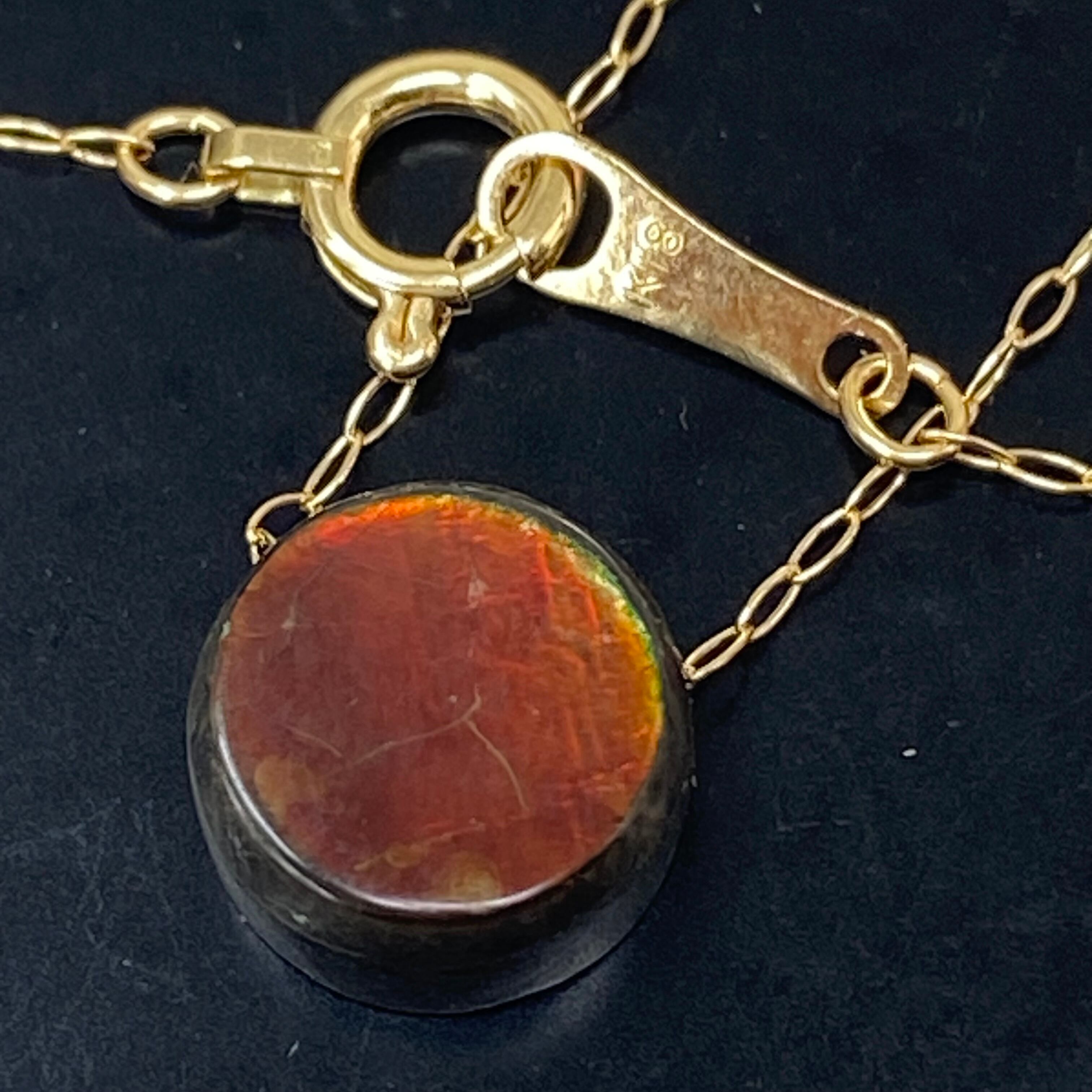 七色の遊色効果を持つ希少な**天然アンモライト**と、**k18イエローゴールド製あずきチェーン**をセットにしたネックレスです。