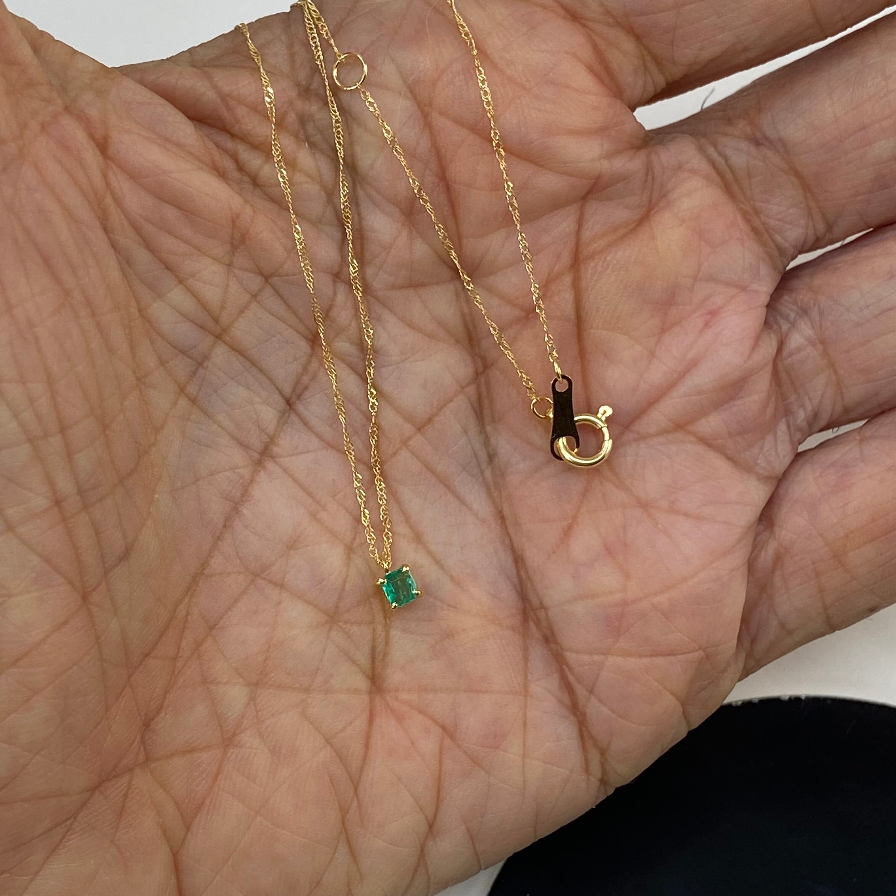 * **華奢なチェーン**: チェーンは**スクリュータイプ(線径0.12mm)**を使用。華奢で繊細な輝きが、エメラルドの美しさを引き立てます。