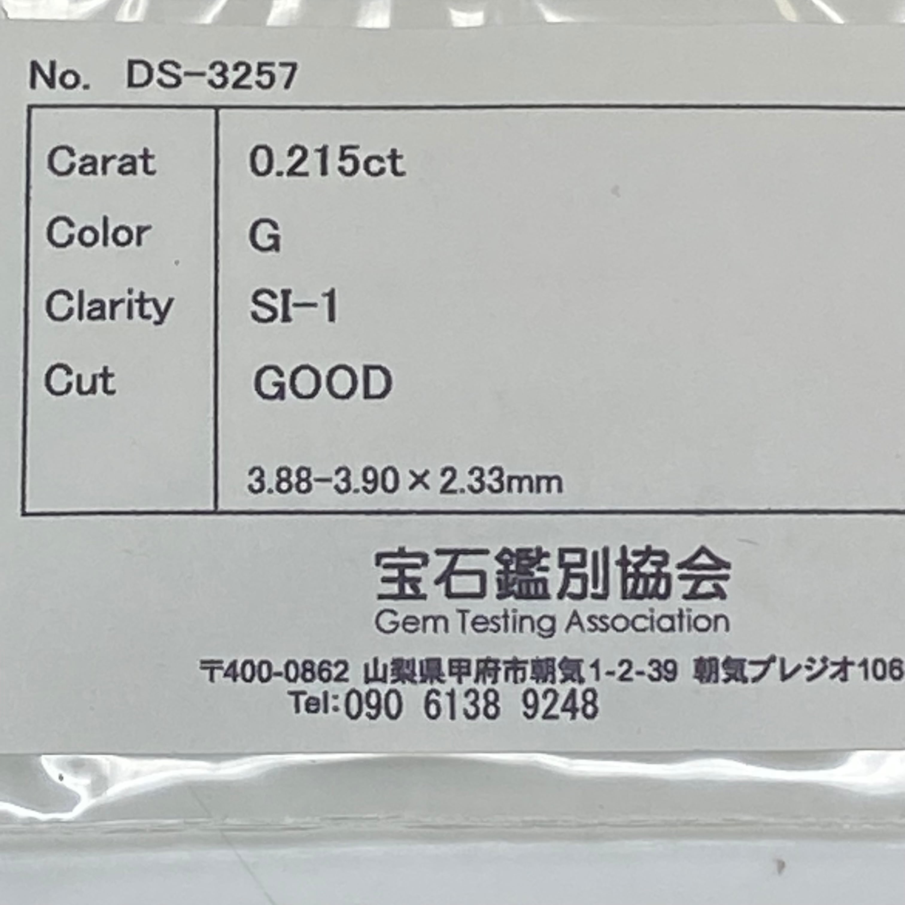 掲載している鑑定画像(0.215ct / G / SI-1 / GOOD)と全く同一のロットから、同グレードの石を厳選して使用しております。