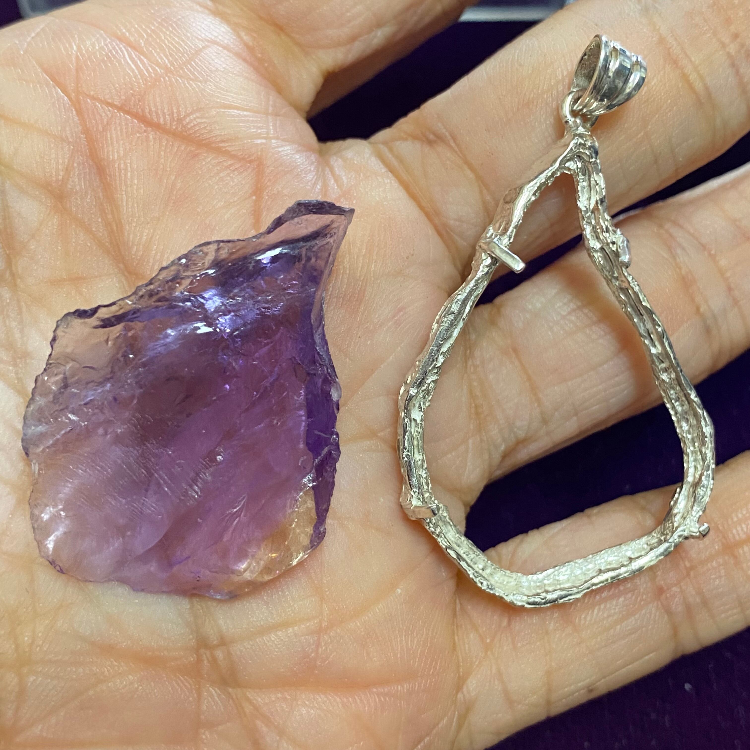 アメシストの紫とシトリンの黄色のコントラストが美しい「天然アメトリン」を、原石の風合いを活かしたラフカットのまま枠に収めました。