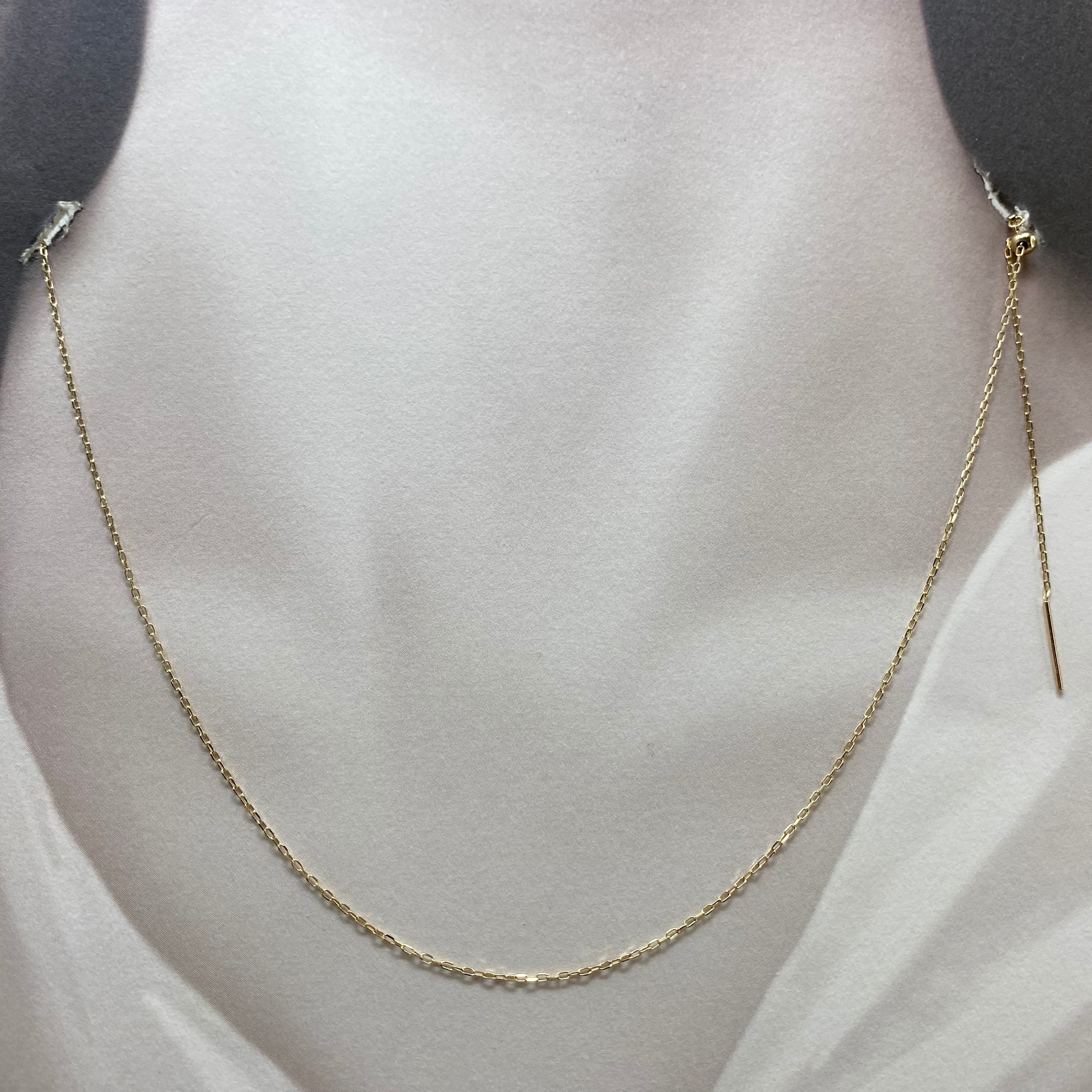 上品な輝きを放つ角あずきチェーンは、どんなペンダントトップとも相性抜群。最大の特徴は、自由な長さ調整が可能な**ピン式スライドアジャスター**です。ネックレスの先端がピン状になっているため、お手持ちの小さなバチカンにも簡単に通すことができ、ジュエリー選びの幅がぐっと広がります。