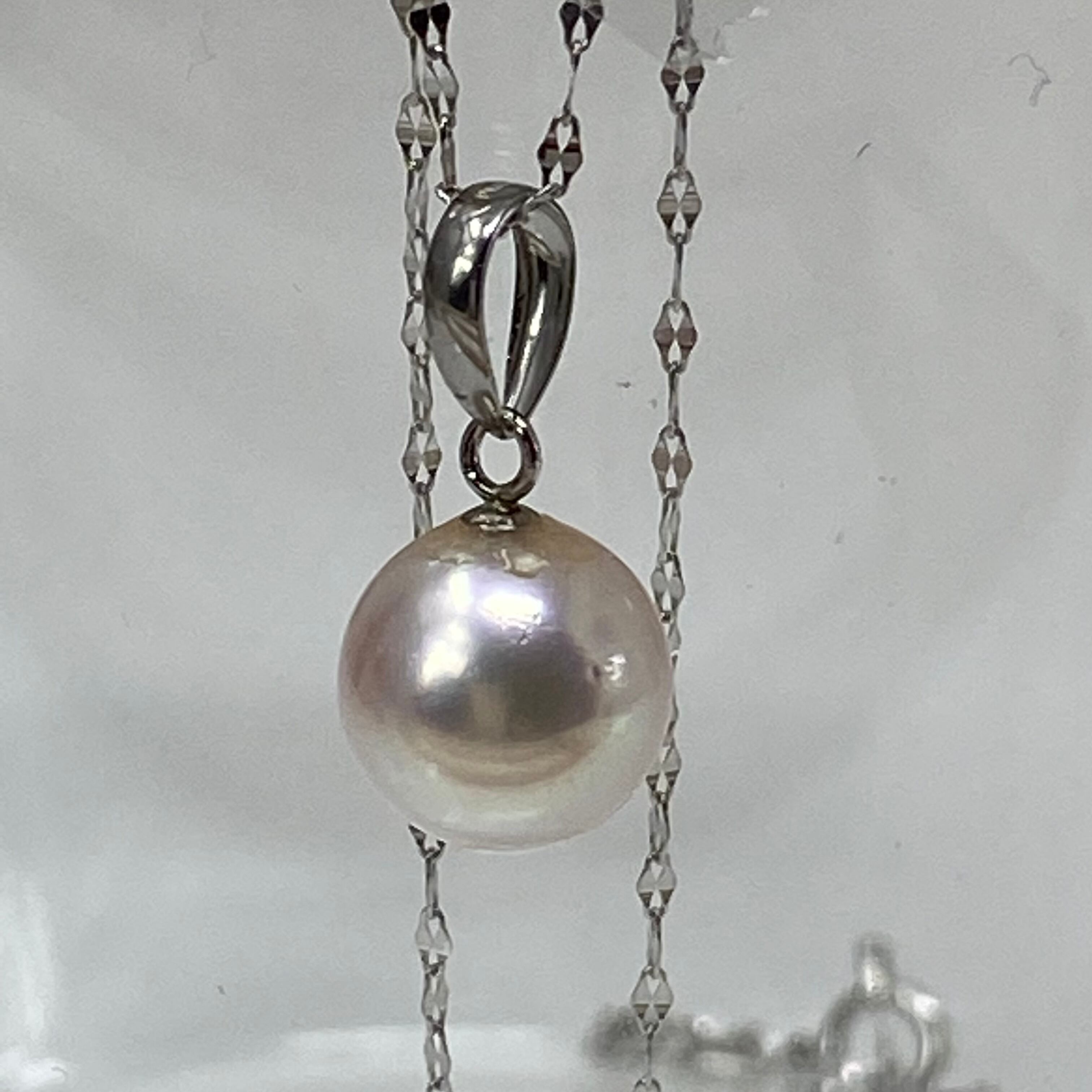 ネックレスチェーンには、あこや真珠の美しさを引き立てる、キラキラと光を反射する**Pt850(プラチナ850)**製のスクエアデザイン「ペタルチェーン」を合わせました。