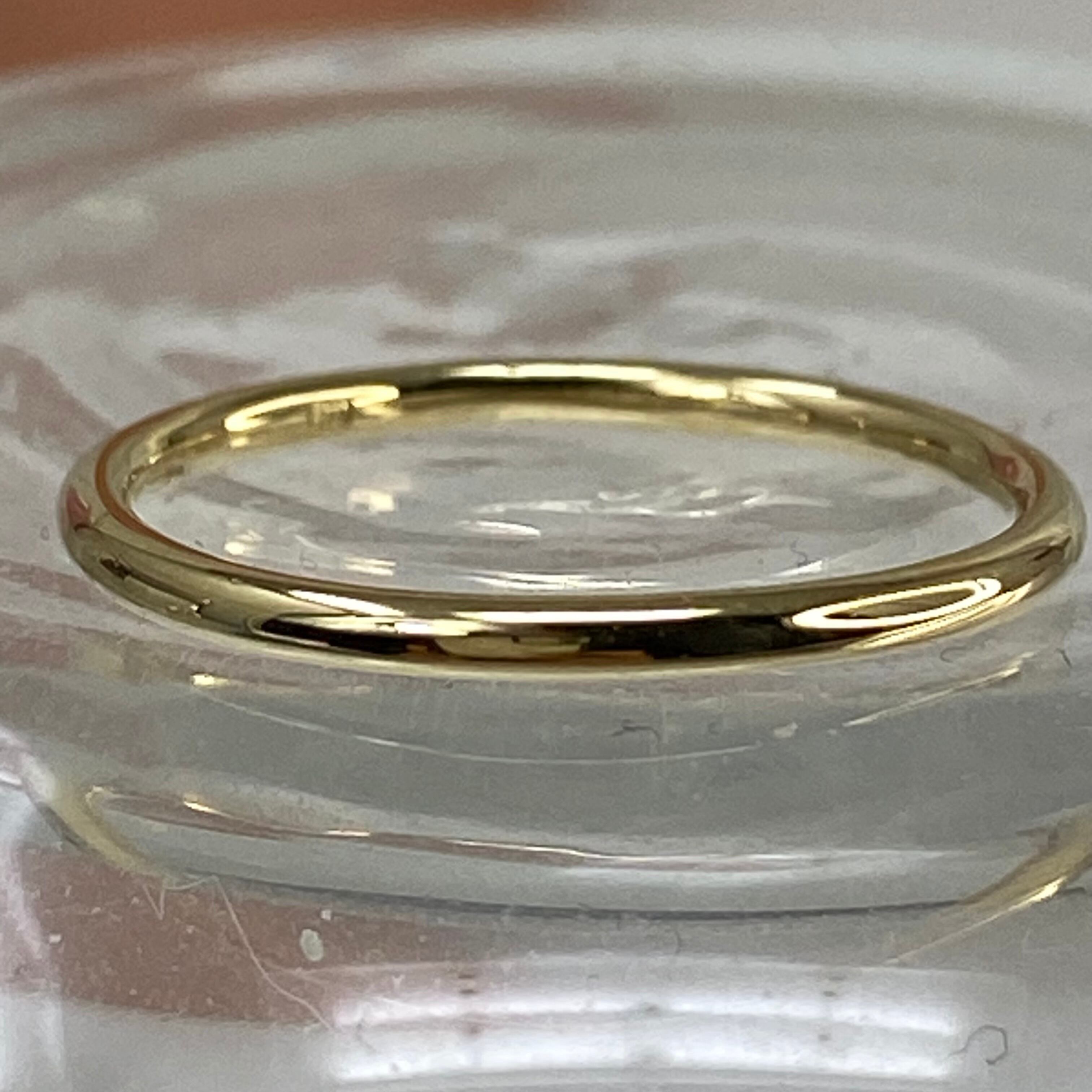 指を美しく見せる、**K18イエローゴールド(AU750、18金)**の華奢なリングです。シンプルを極めたデザインなので、単体で繊細な美しさを楽しむのはもちろん、お手持ちのリングと重ね付けしたり、リングストッパーとしても活躍します。