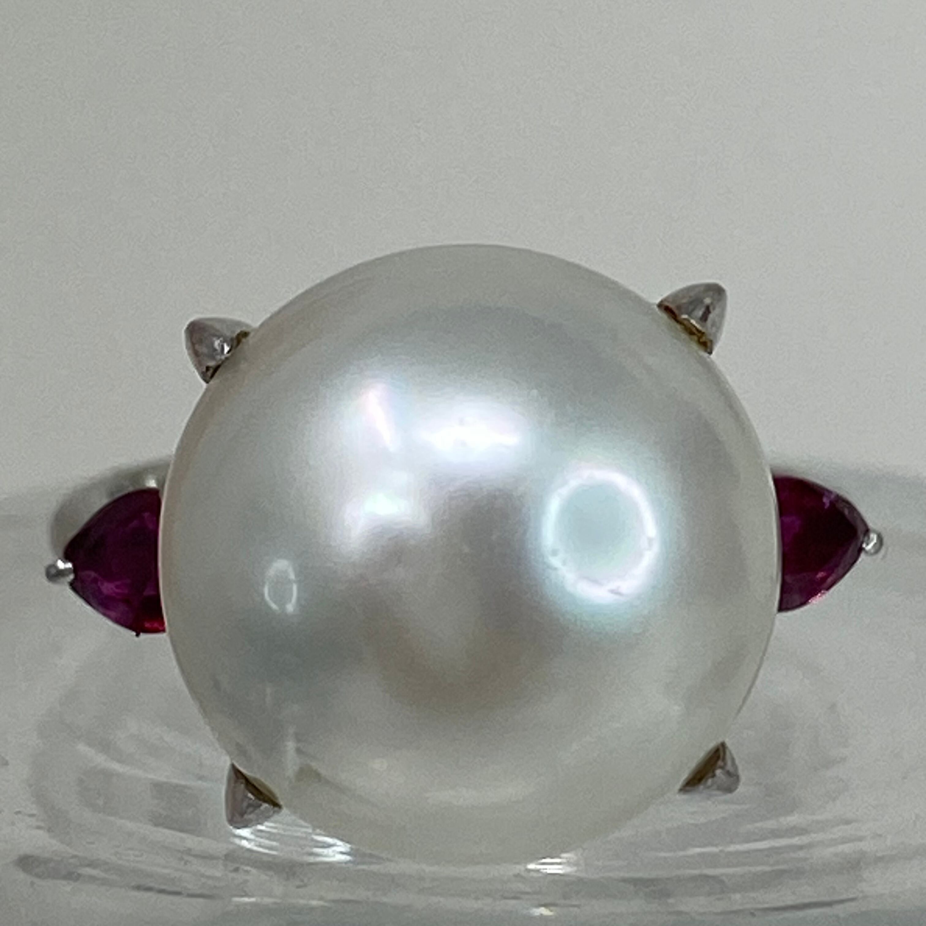 圧倒的な存在感を放つ、**大粒14.4mmの南洋真珠**を使用したpt900プラチナリングです。真珠の両サイドには、鮮やかな天然ルビーが合計0.55カラットセットされ、華やかさと品格を添えています。