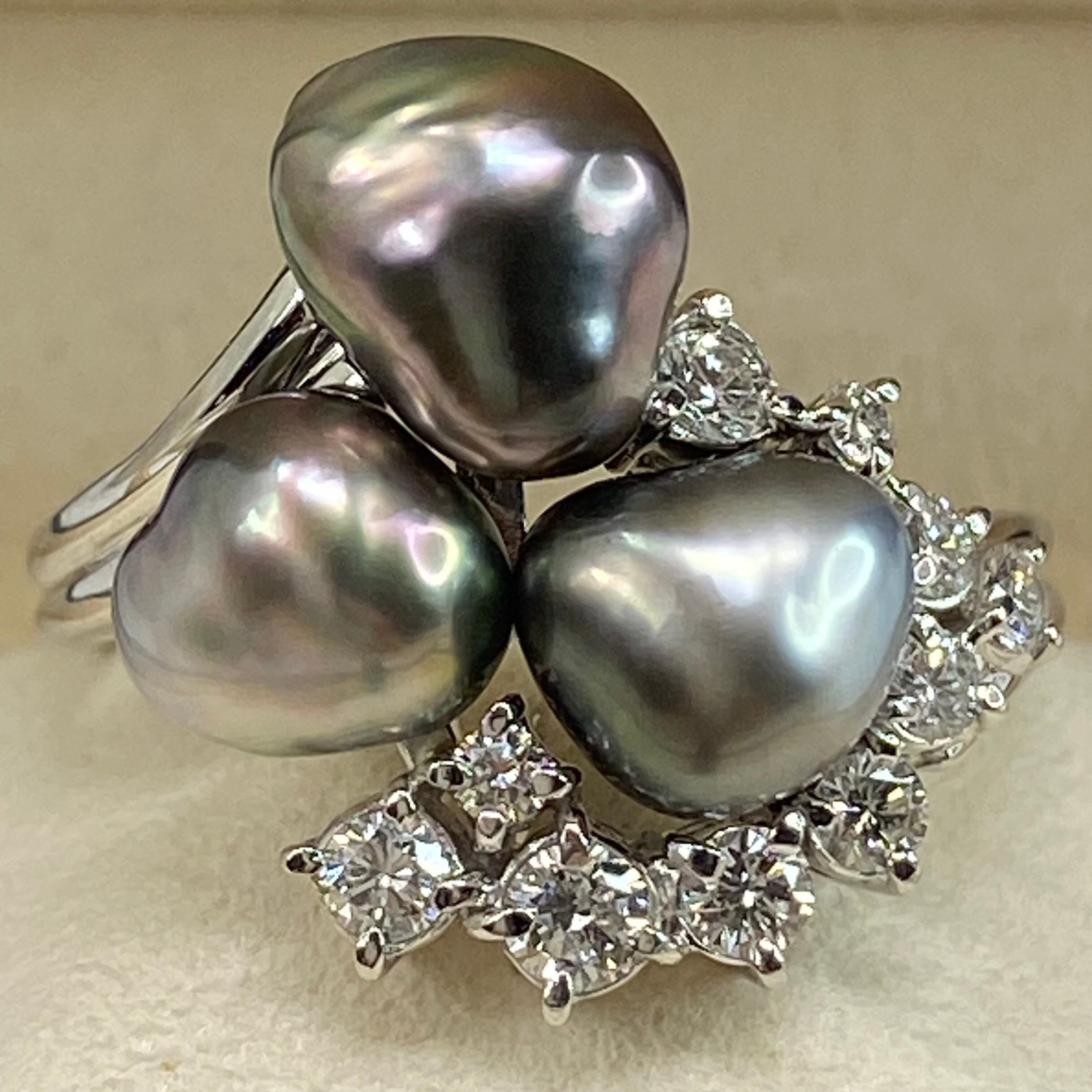 世界的なジュエリーブランド、**MIKIMOTO(ミキモト)**のリング枠を使用した、非常に珍しい南洋ケシ真珠とダイヤモンドのリングです。