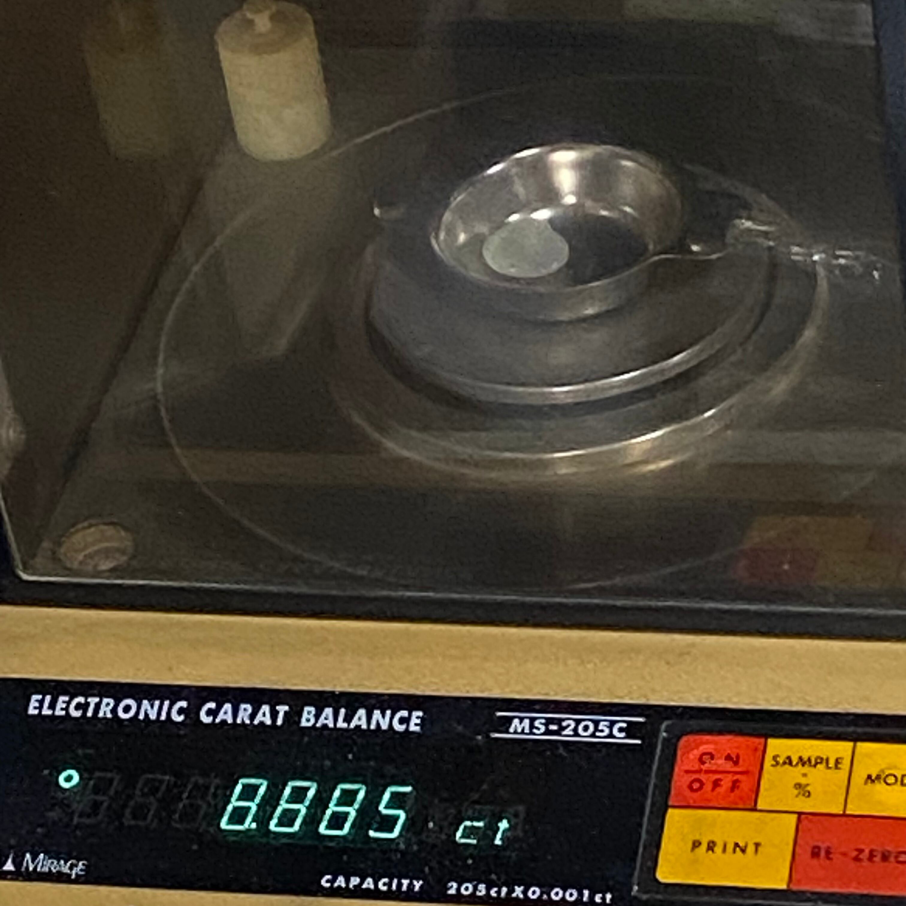 **8.85カラット**という大粒のボリューム。表面には、見る角度によって、**グリーンを基調とした繊細なブルーの遊色**(虹色の輝き)が美しく浮かび上がります。